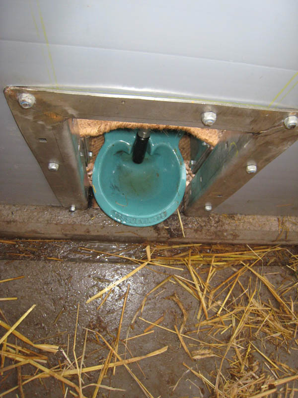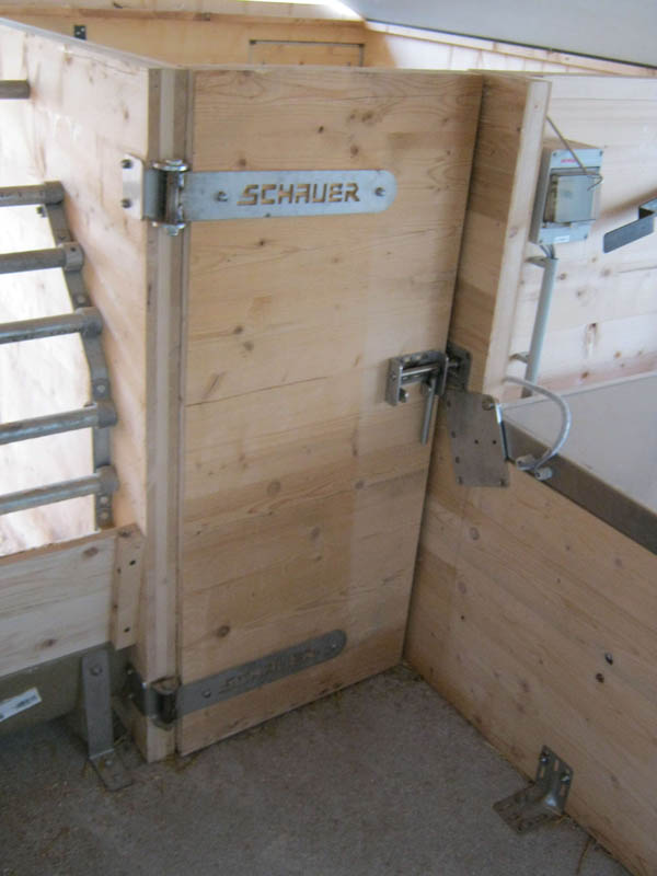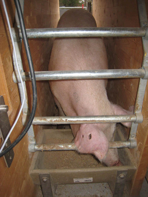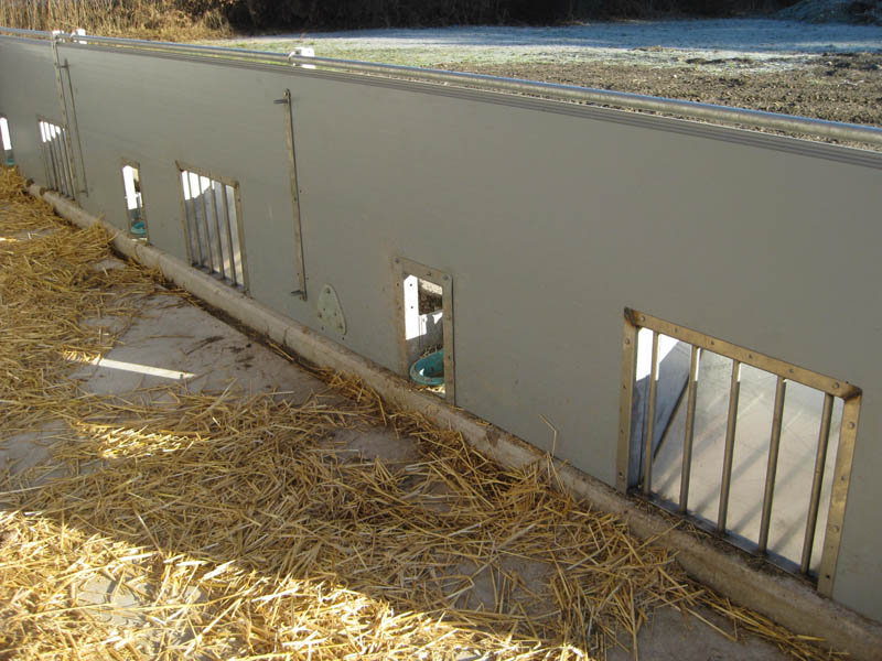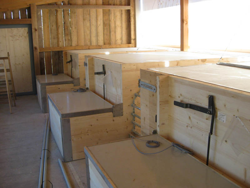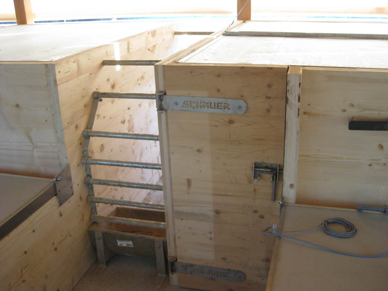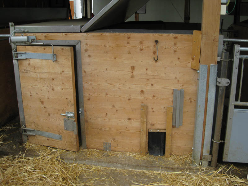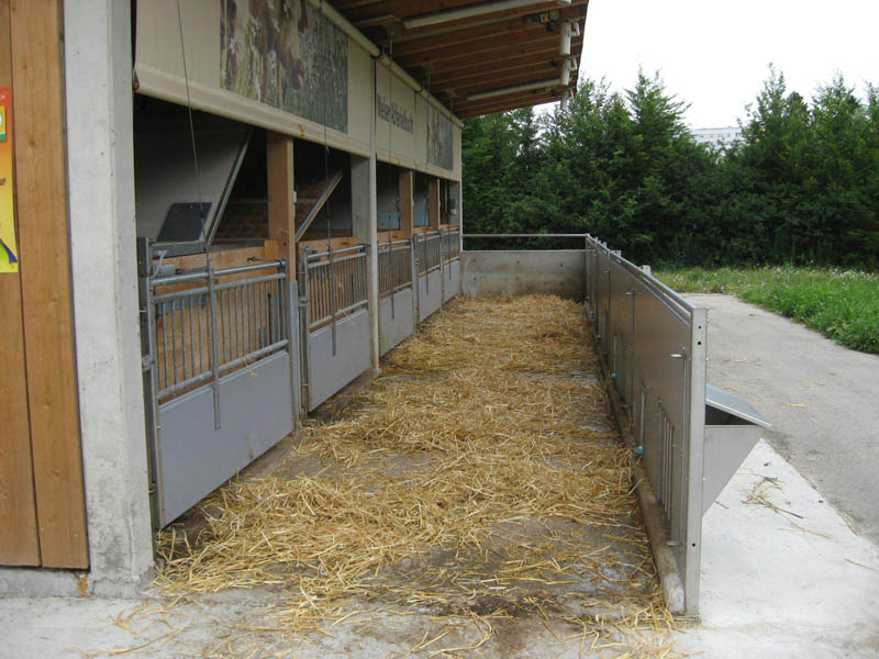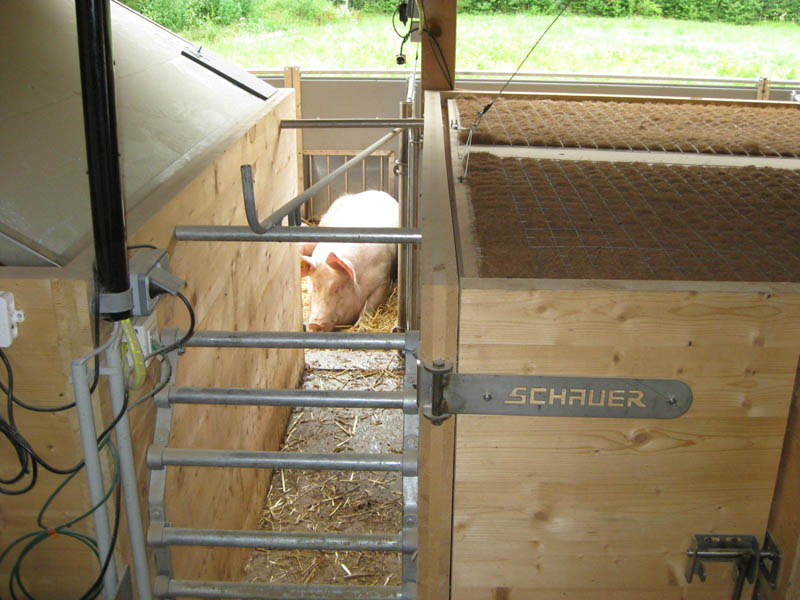 Dadurch bleibt der Liegebereich sauber und trocken. Im Auslauf befindet sich neben dem Tränkebecken auch eine Futterraufe zur Verabreichung von Grundfutter (Heu, Silage). So wird der Auslauf zu einem attraktiven Funktionsbereich, der auch zum Kot- und Harnabsatz anregt. Da Ferkelnest und Sauenfressplatz zum Bedienungsgang hin angelegt sind, können sowohl die Sau, als auch die Ferkel gut beobachtet werden. Zum Ausmisten werden die Trenngitter geschlossen, wobei automatisch Ferkel und Sau in der Liegekiste oder im Fressstand eingesperrt werden. Eine vorgelagerte Stufe auf beiden Seiten schützt die Stalleinrichtung (Tränkebecken, Raufe, Trenngitter) und ermöglicht die einfache Entmistung mittels Hoftraktor.